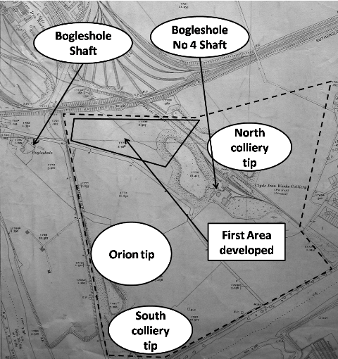 As can be seen the site orignially included disused mineworkings, railway lines running tot he nearby Clyde Iron Works, and other industrial works. The two mineshafts shown had been so well hidden that they required careful exploration work to identify them.